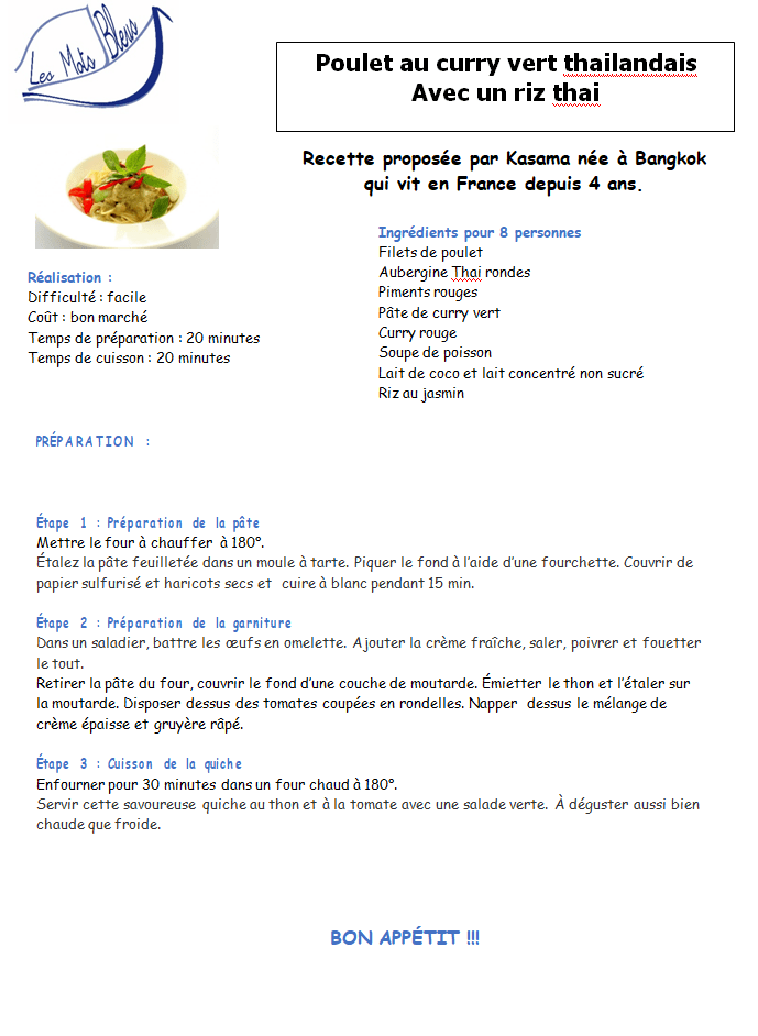 05/10/202324/10/2023 Claudinemotsbleus Poulet au curry vert thailandais Kasama nous propose un plat emblématique de Thailande. Vendredi 23 mai 2022 Partager sans moderation Partager sur Facebook(ouvre dans une nouvelle fenêtre) Facebook Imprimer(ouvre dans une nouvelle fenêtre) Imprimer Partager sur WhatsApp(ouvre dans une nouvelle fenêtre) WhatsApp J’aime chargement… Similaire