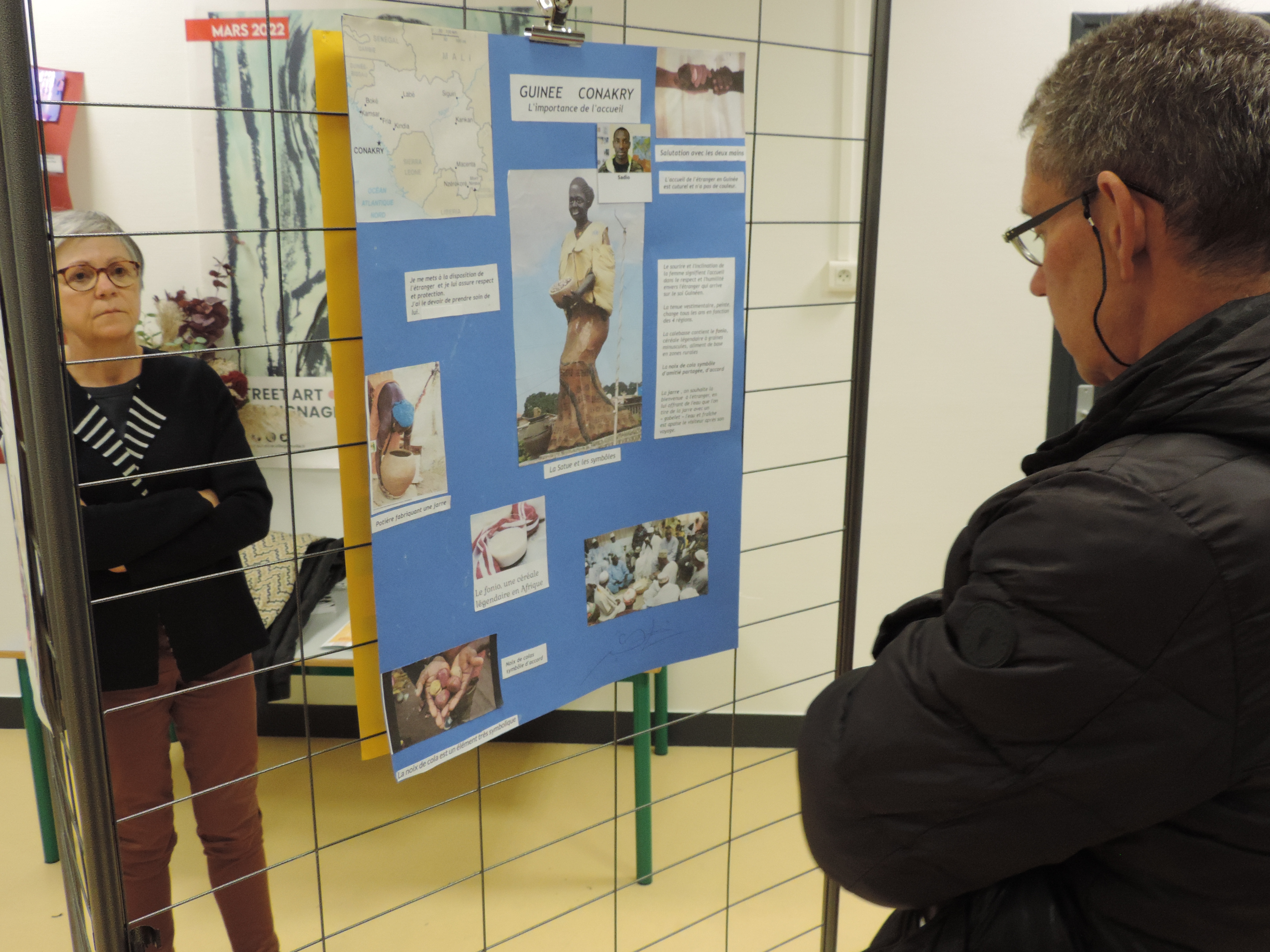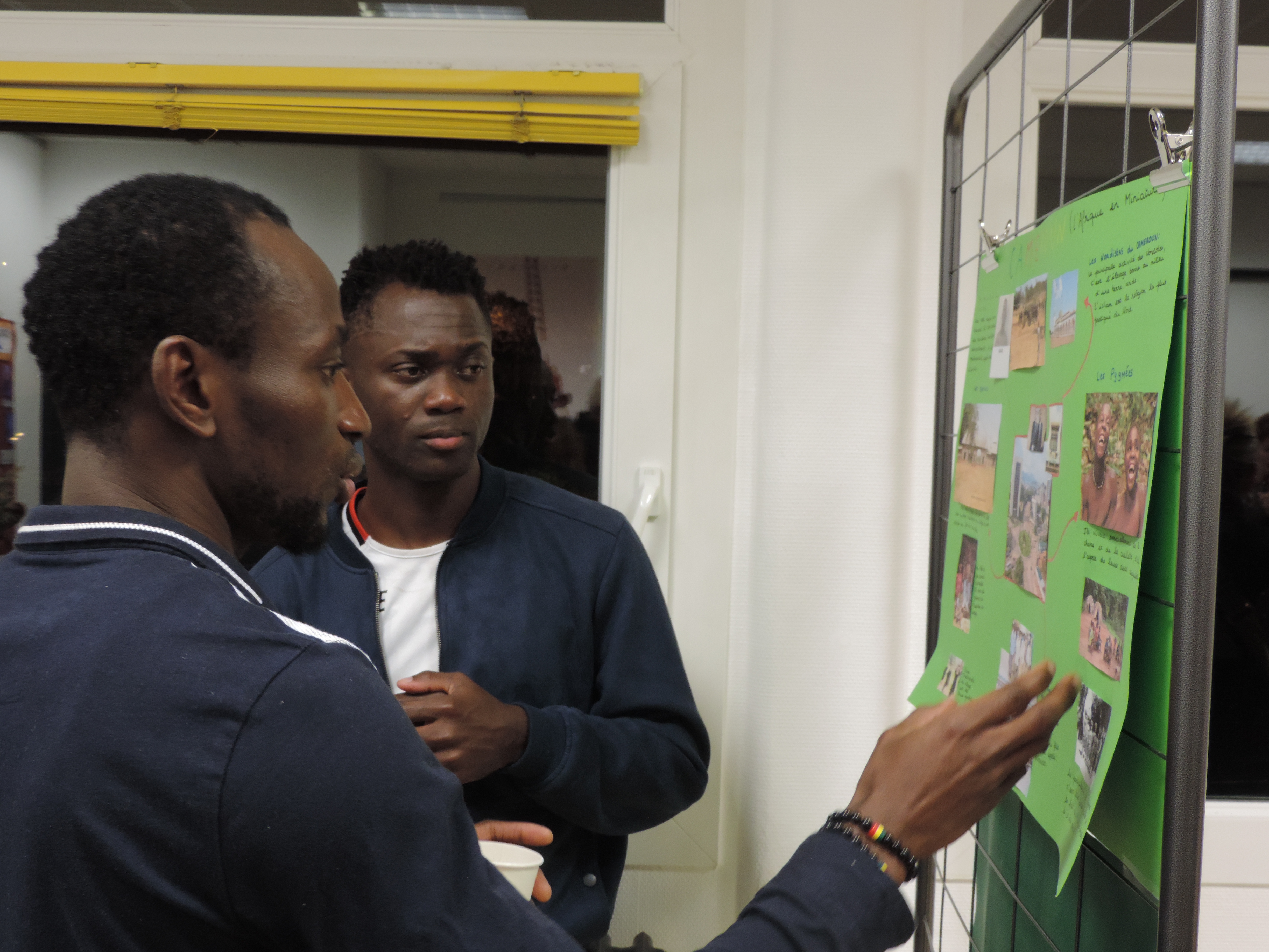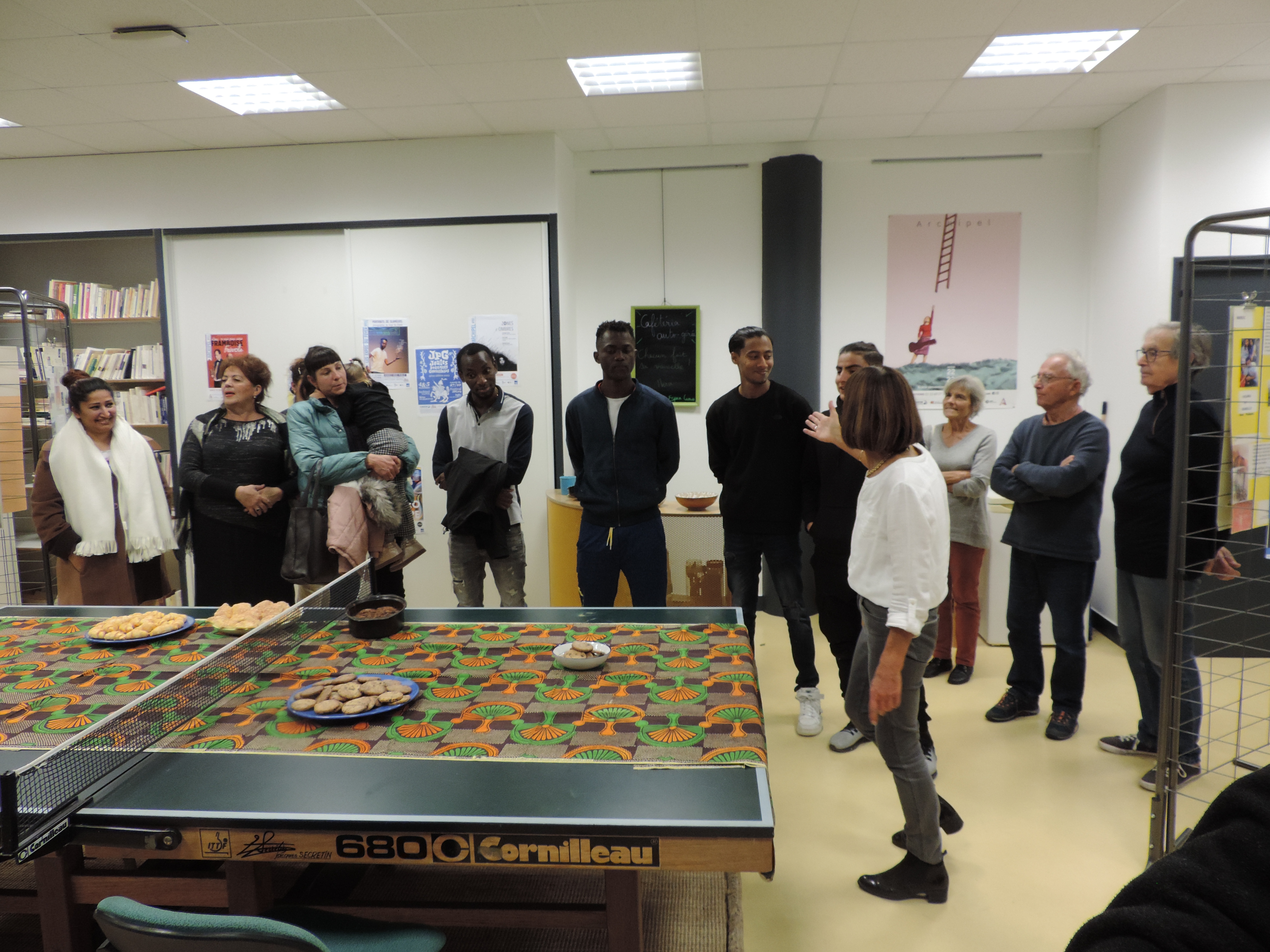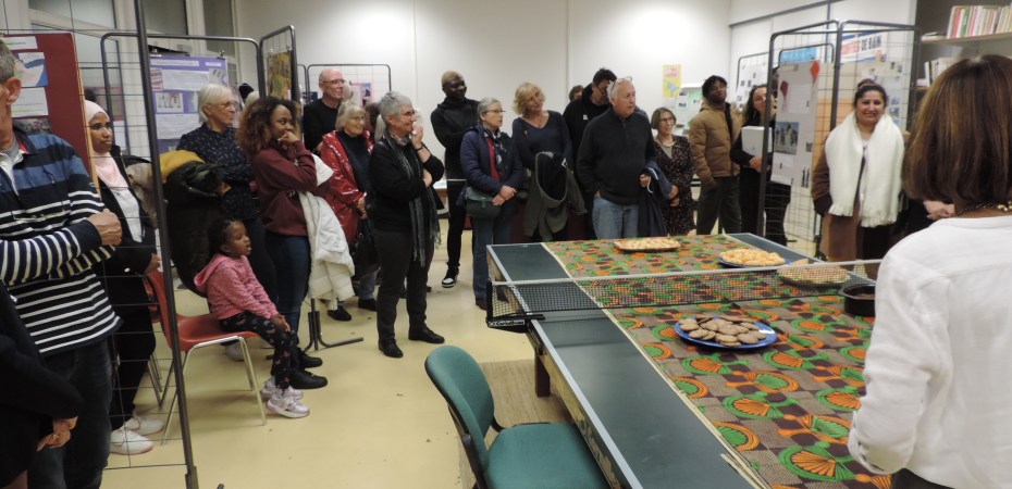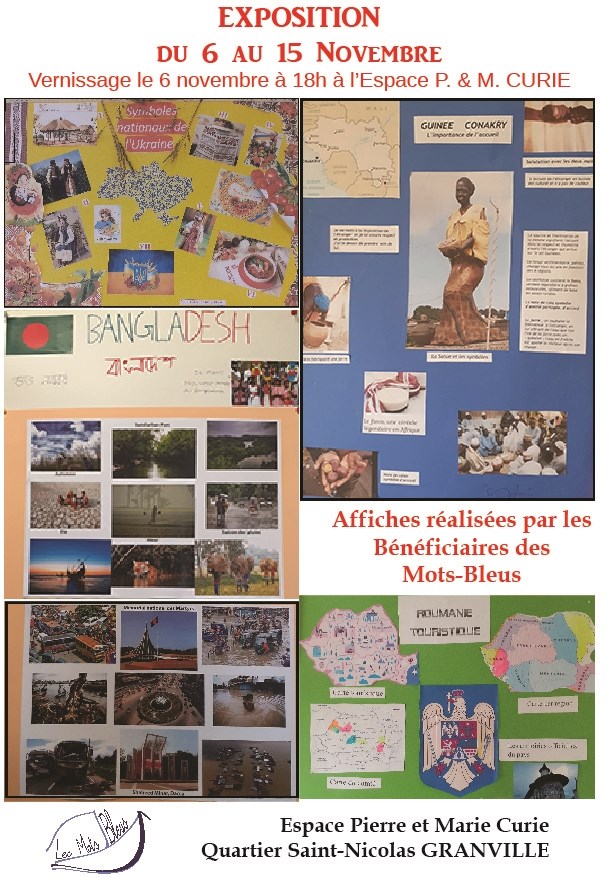 La présidente, Nicole Renouf, en présence d’un public de bénéficiaires et de bénévoles, a procédé au vernissage de l’exposition des 15 affiches réalisées par des bénéficiaires des Mots Bleus. Ils ont pu se présenter et répondre aux questions sur les ressources et richesses de leur pays ainsi que sur les pratiques culturelles et politiques.