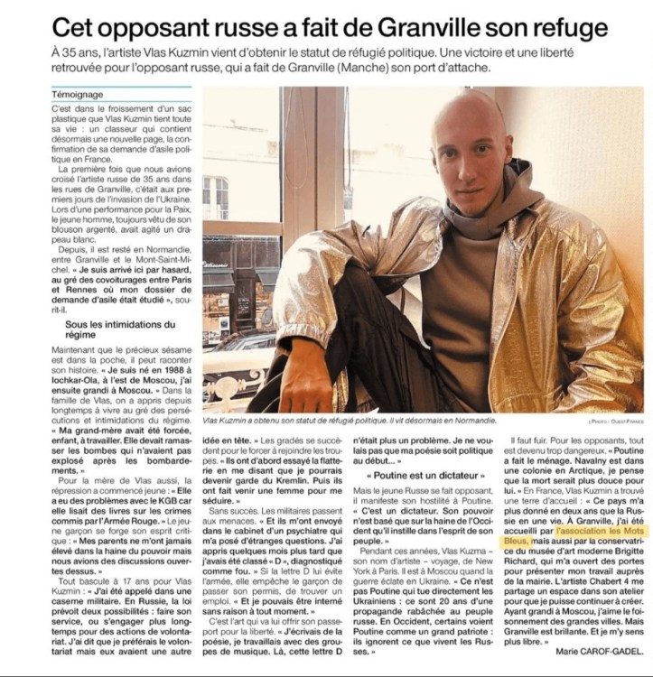Vlas Kuzmin, un opposant russe, raconte à Ouest-France, édition du vendredi 29 décembre 2023, son parcours pour obtenir le statut de réfugié politique accordé par la France. Il vit à Granville et parle des aides qu’il a reçues et notamment de l’association Les Mots Bleus. On lui adresse toutes nos félicitations pour son courage et sa détermination, ainsi que nos meilleurs voeux pour sa carrière artistique.