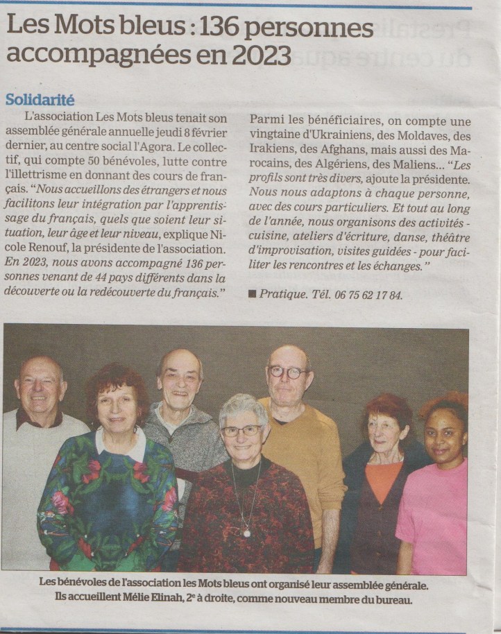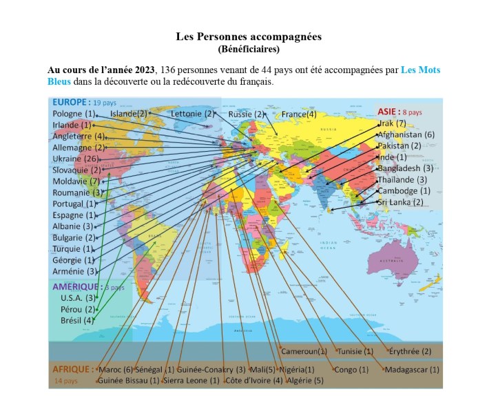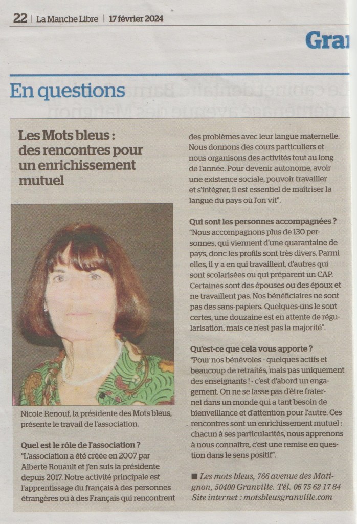 11/02/202418/02/2024 Claudinemotsbleus Assemblée Générale 2024 Le bilan d’activité 2023 de l’association Les Mots Bleus Texte AG 2024 – exercice 2023Télécharger Origine géographique des bénéficiaires en 2023. Edition Manche Libre 17 février 2024 Partager sans moderation Partager sur Facebook(ouvre dans une nouvelle fenêtre) Facebook Imprimer(ouvre dans une nouvelle fenêtre) Imprimer Partager sur WhatsApp(ouvre dans une nouvelle fenêtre) WhatsApp J’aime chargement… Similaire