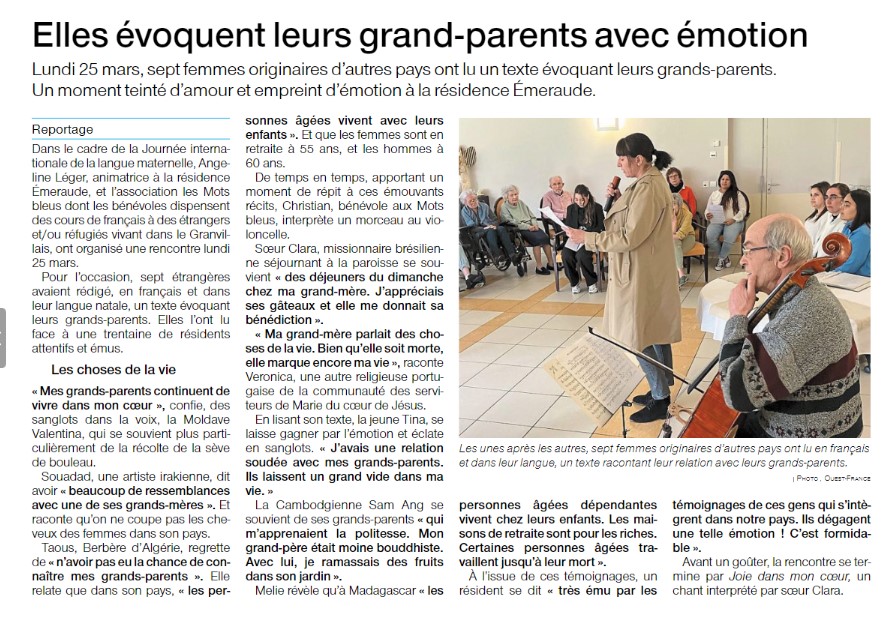 02/04/2024 Claudinemotsbleus Journée de la langue maternelle à la maison de retraite de l’Emeraude à Granville Ouest-France 2 avril 2024 Partager sans moderation Partager sur Facebook(ouvre dans une nouvelle fenêtre) Facebook Imprimer(ouvre dans une nouvelle fenêtre) Imprimer Partager sur WhatsApp(ouvre dans une nouvelle fenêtre) WhatsApp J’aime chargement… Similaire