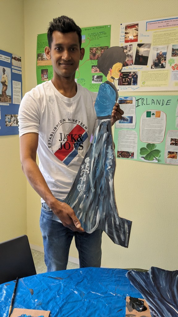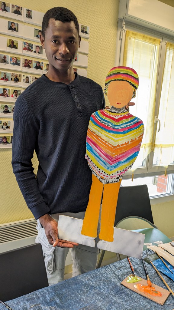 « Mon bonhomme est vêtu d’un poncho multicolore : rouge, jaune, vert, bleu. Son pantalon est orange. Il porte des grosses chaussures pour marcher dans la montagne. Il est coiffé d’un bonnet en laine de lama. Sur son menton, j’ai peint une barbichette, dit Alseny. Il s’appelle MOBLEU. »