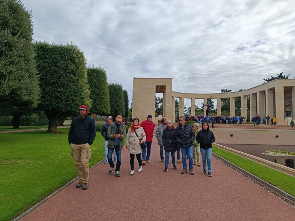 Nous arrivons à Colleville-sur-Mer. C’est un cimetière pour les soldats américains. Les pierres tombales sont blanches, en forme de croix. Certaines ont une étoile de David, symbole des personnes juives. « Ils sont 9 387 morts pour notre liberté ». Merci pour cette belle journée culturelle et amicale. Une réussite !
