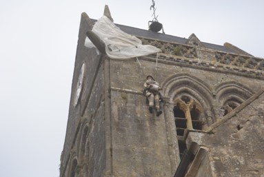 Dans cette commune de Sainte Mère-Eglise, des parachutistes se posent. Un soldat reste accroché au clocher de l’église. C’est une situation comique et pourtant, c’est la guerre.