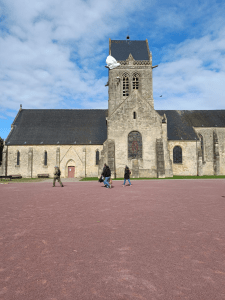 L’étape suivante était la ville de Saint-Mère-Église, qui est la première ville libérée lors de l’opération Overlord. Dans la nuit du 5 au 6 juin 1944, les unités alliées des 101e et 82e divisions sont parachutées à l’intérieur du pays pour créer une diversion et préparer l’offensive à venir. Le débarquement fut soutenu par les bombardements et de nombreux bâtiments furent touchés et prirent feu. L’un d’entre eux était l’église de Saint-Mère-Église, où les habitants ont commencé à éteindre le feu avec les troupes allemandes. Au même moment, les parachutistes ont commencé à débarquer dans la ville et ses environs. La figure emblématique de la soirée était le soldat John Steele, dont le parachute s’est accroché au clocher de l’église en feu et il est resté suspendu à son propre parachute. Il a été grièvement blessé et a fait semblant d’être mort. La figurine suspendue du parachutiste se trouve encore aujourd’hui sur l’église et les habitants la considèrent comme un symbole de libération. Il y a aussi une statue du général Dwight Eisenhower près de l’église.