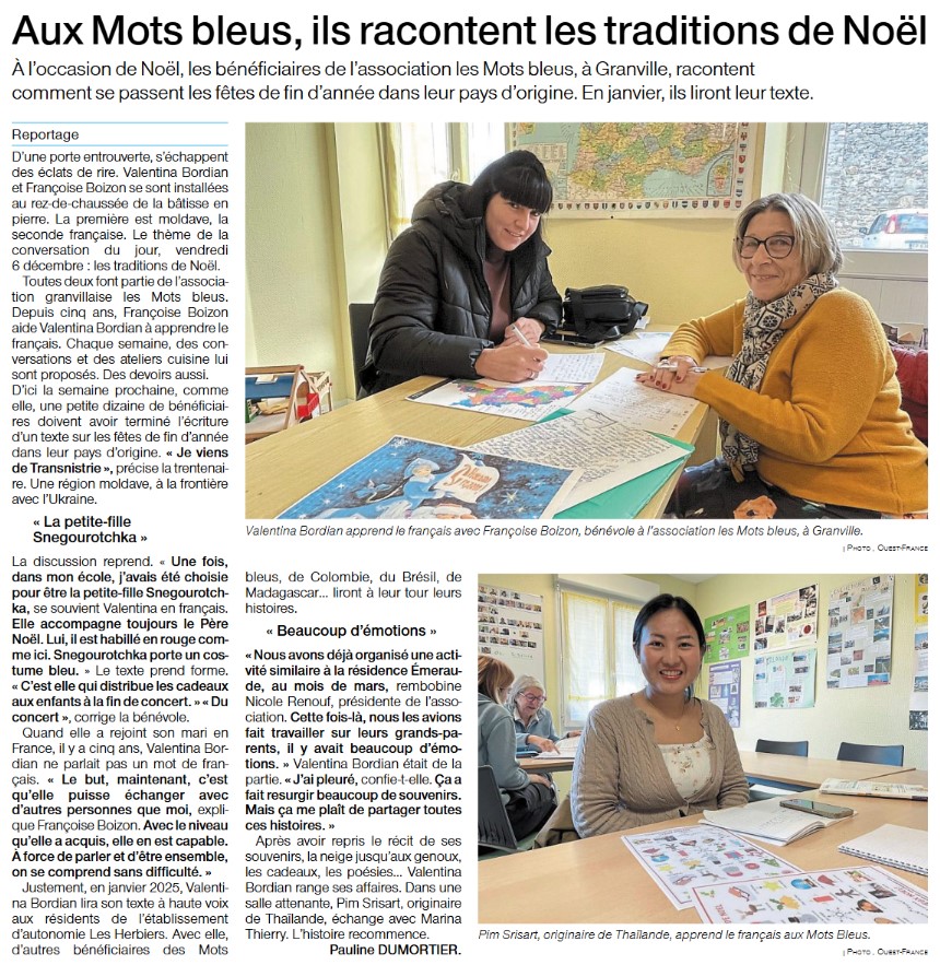08/12/2024 Claudinemotsbleus A l’association des Mots Bleus les bénéficiaires racontent les fêtes de leur pays. Publié dans l’édition Ouest-France du 7 décembre 2024 Partager sans moderation Partager sur Facebook(ouvre dans une nouvelle fenêtre) Facebook Imprimer(ouvre dans une nouvelle fenêtre) Imprimer Partager sur WhatsApp(ouvre dans une nouvelle fenêtre) WhatsApp J’aime chargement… Similaire