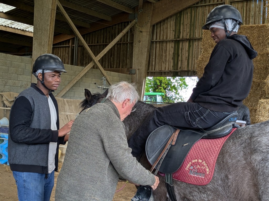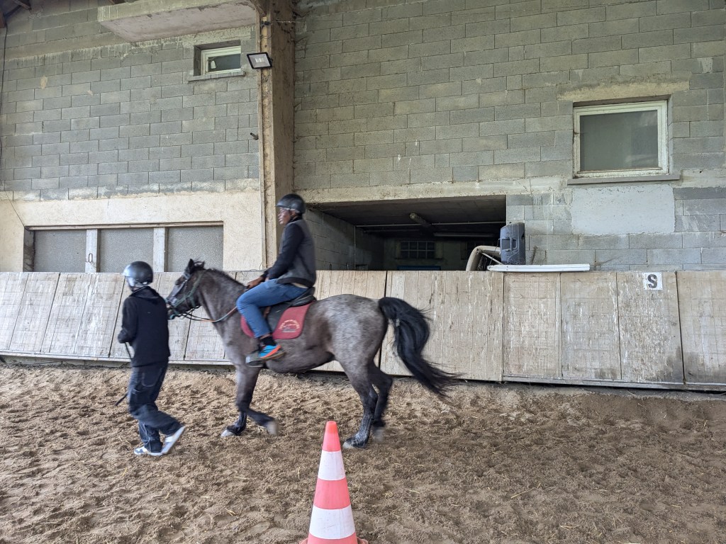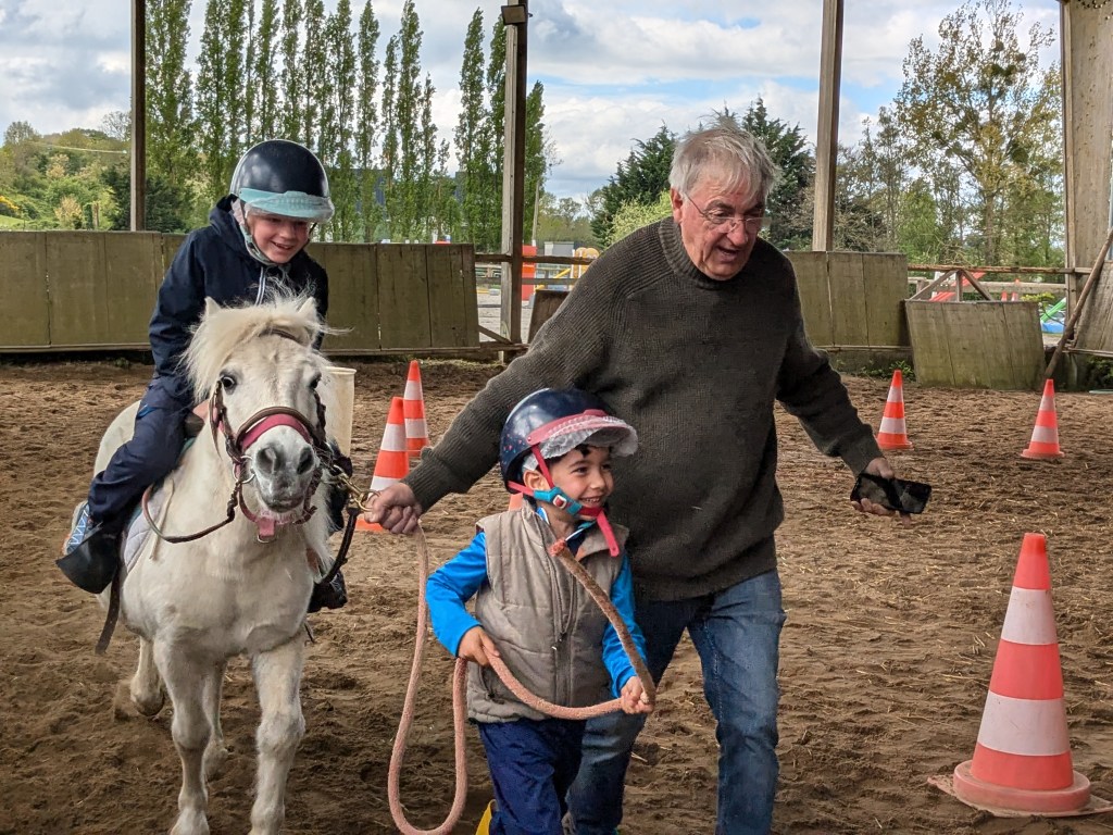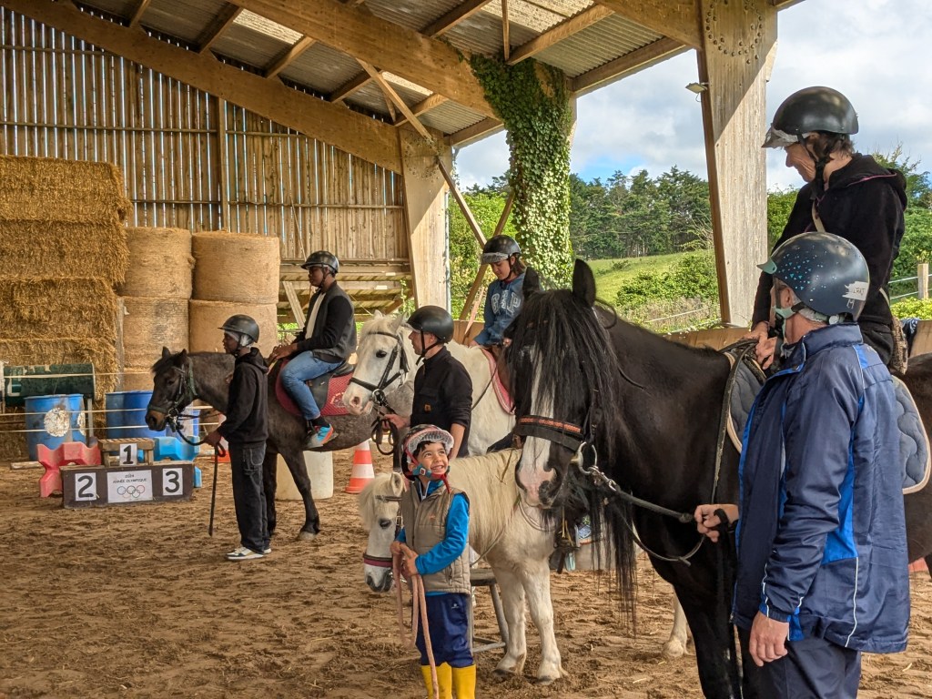 « Un contact tout en douceur avec les poneys. Après les avoir sellés, proposition d’une course chronométrée par équipe de deux, deux tours avec changement de cavalier.