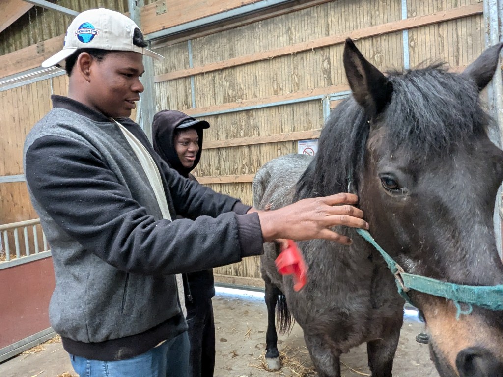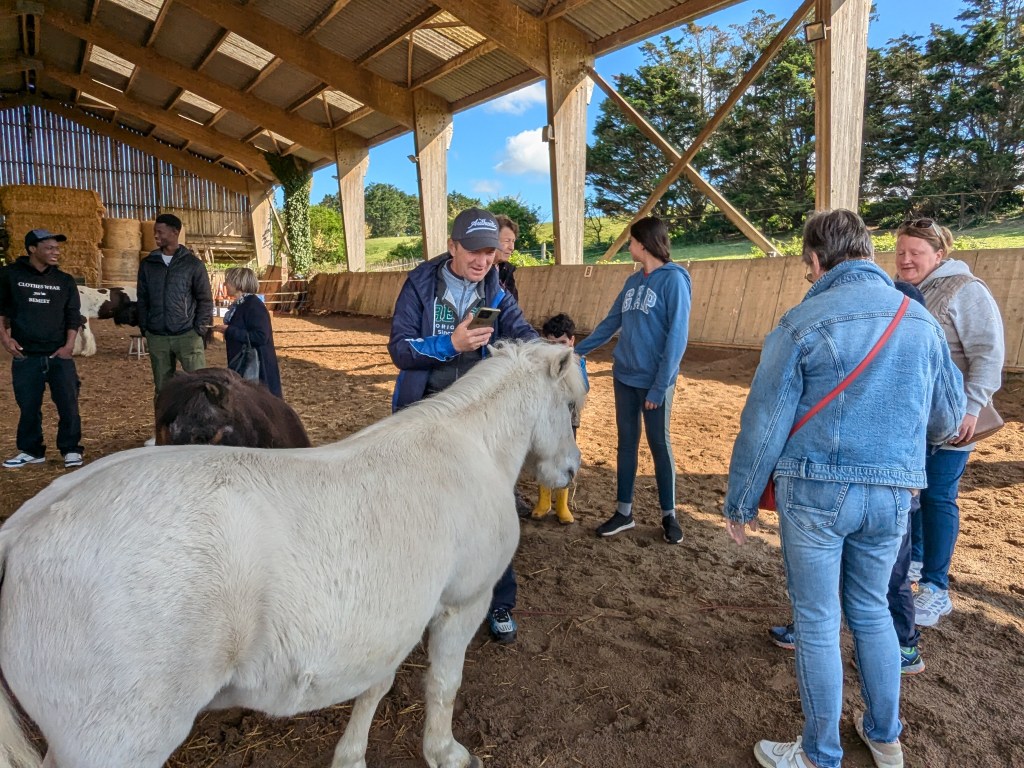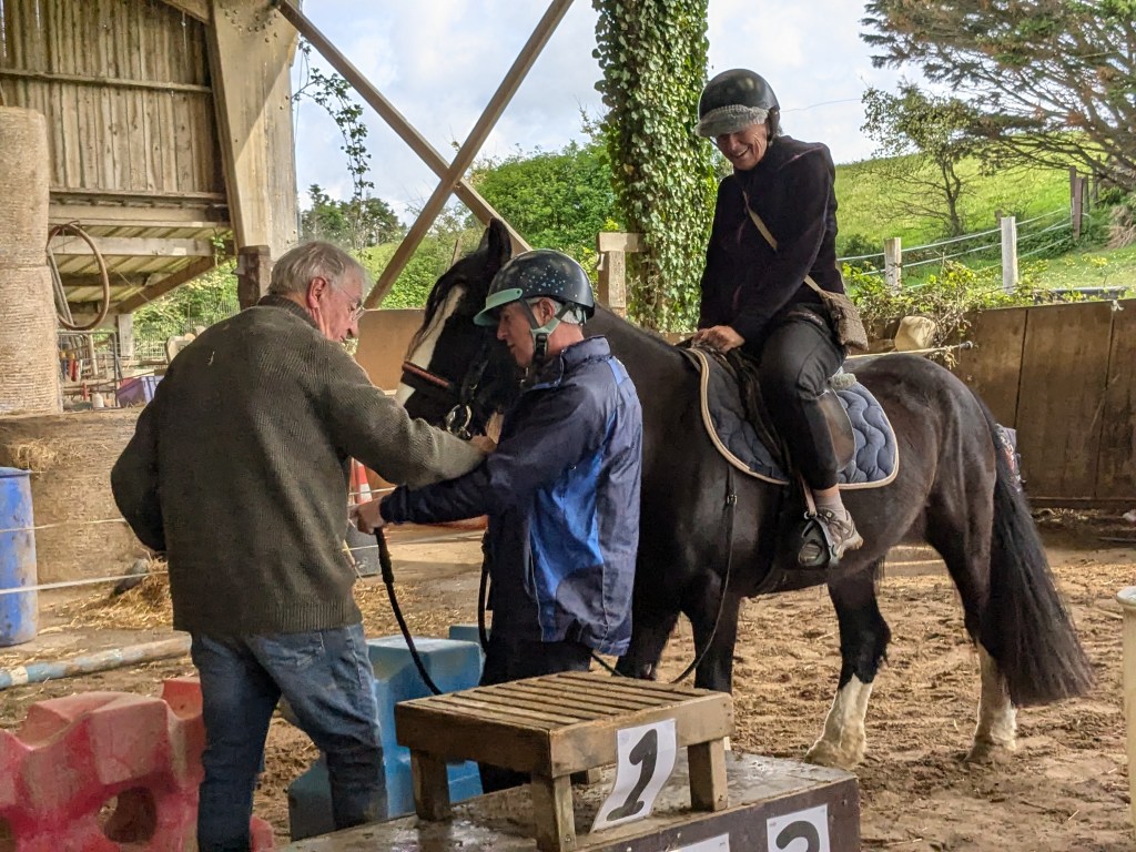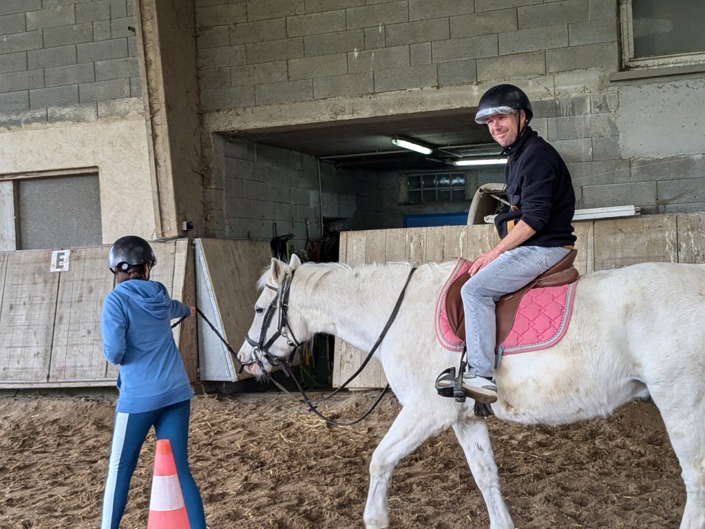 « Un contact tout en douceur avec les poneys. Après les avoir sellés, proposition d’une course chronométrée par équipe de deux, deux tours avec changement de cavalier.