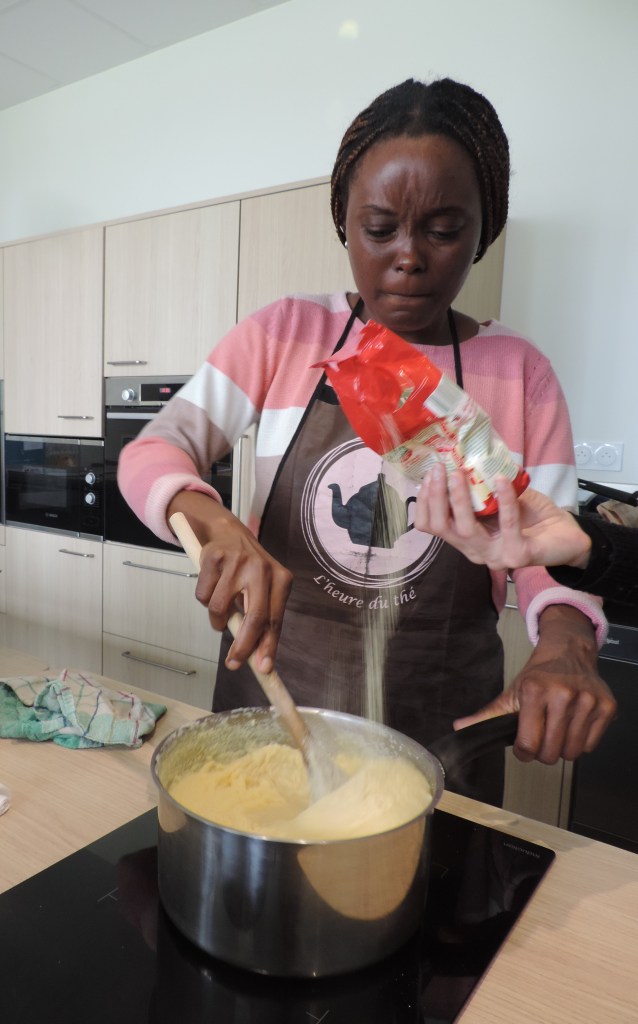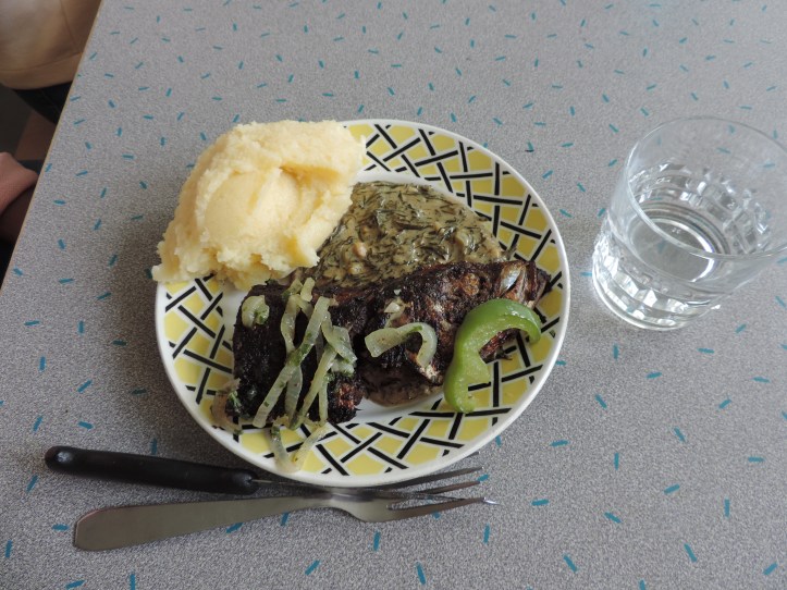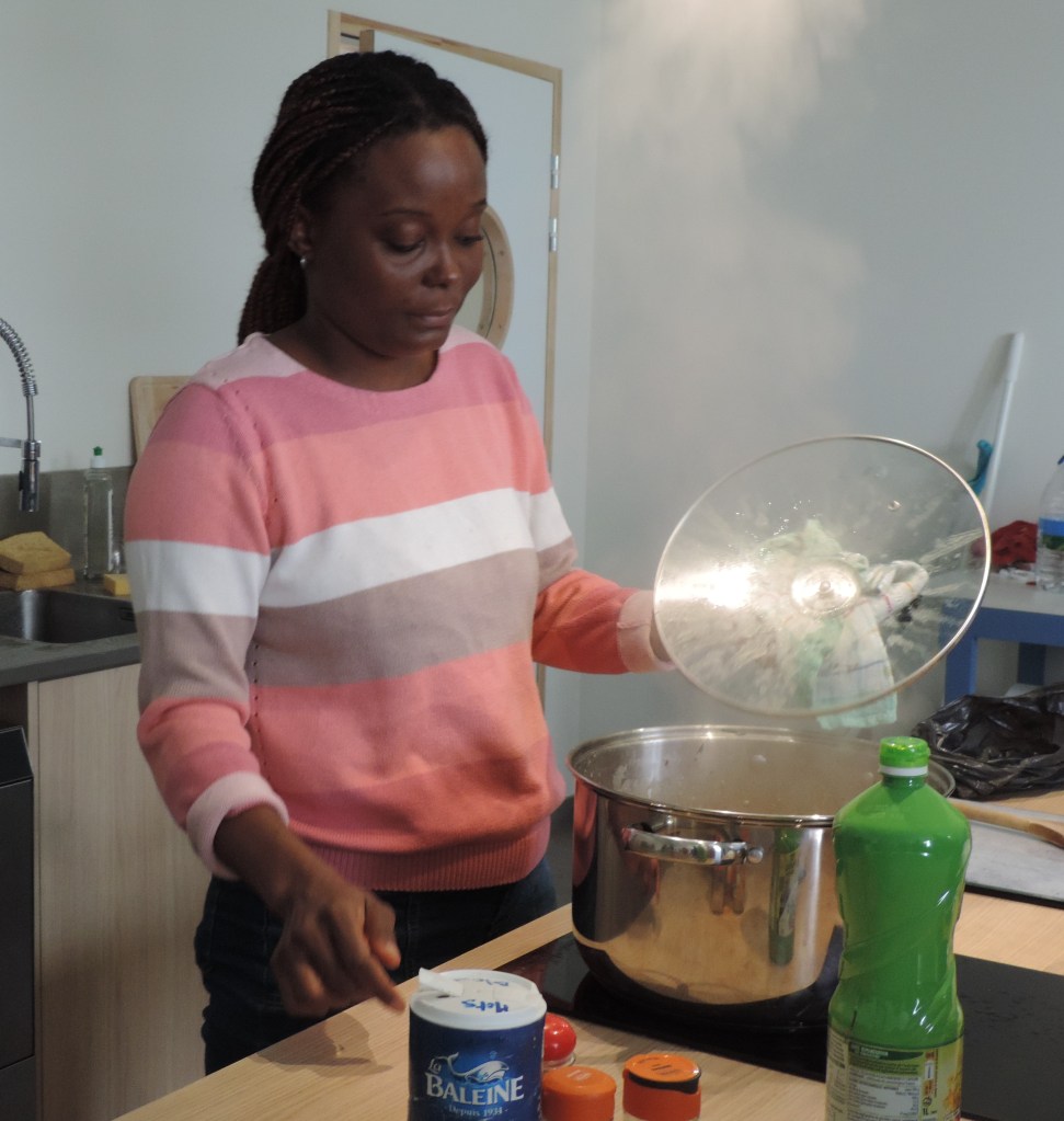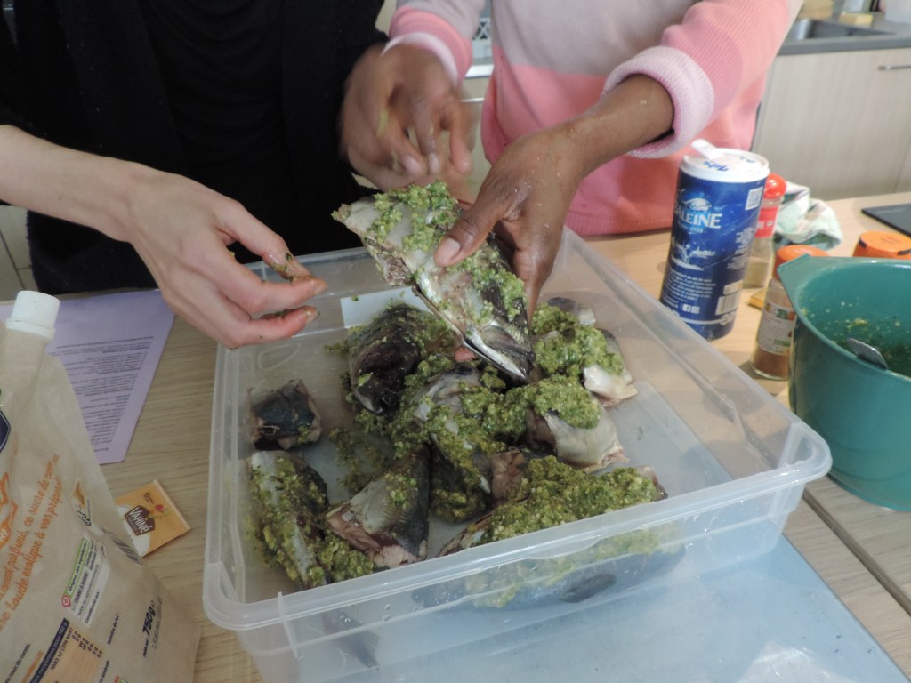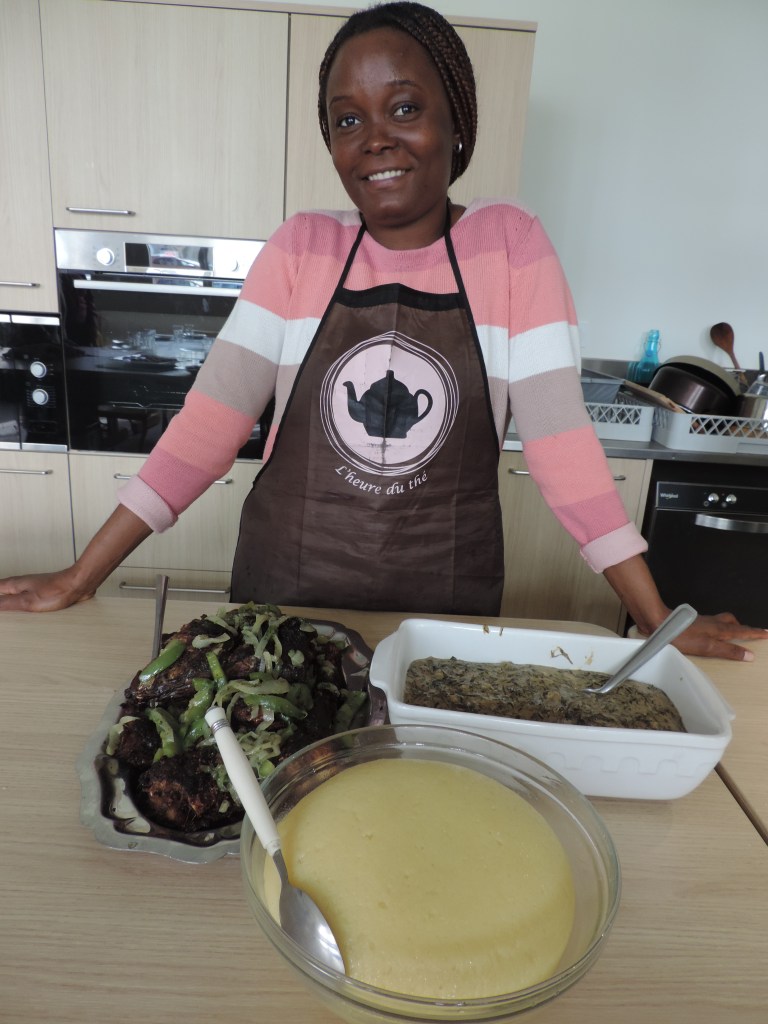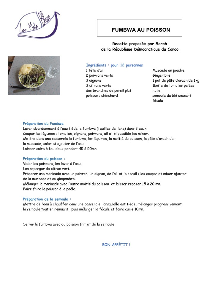 Merci à Sarah de nous avoir fait goûter ce plat congolais typique à base de fumbwa ( feuille de liane), de pâte d’arachide et d’un poisson peu connu : le chinchard..